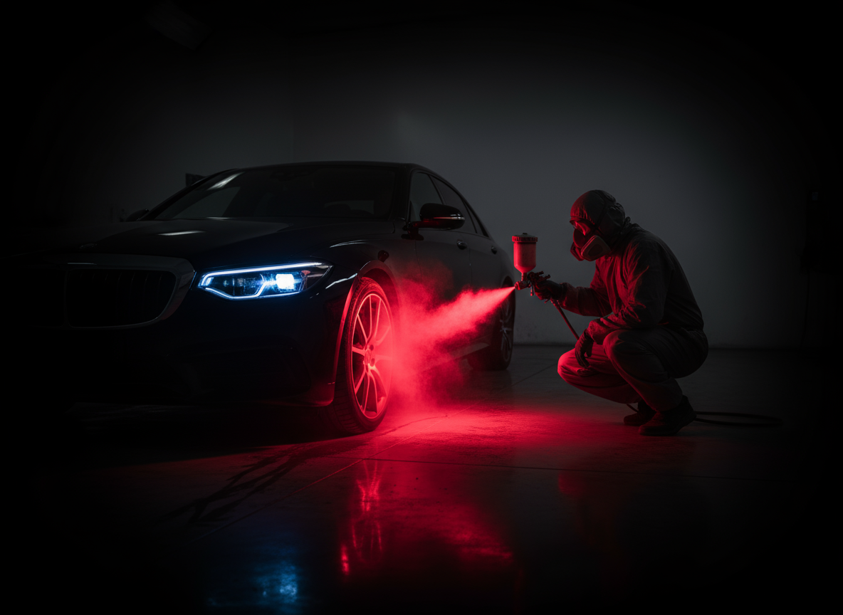 Atelier de carrosserie utilisant des peintures professionnelles MaxMeyer et des procédés certifiés garantissant une finition équivalente à la qualité constructeur.